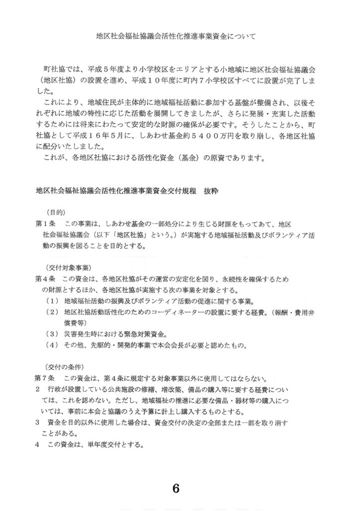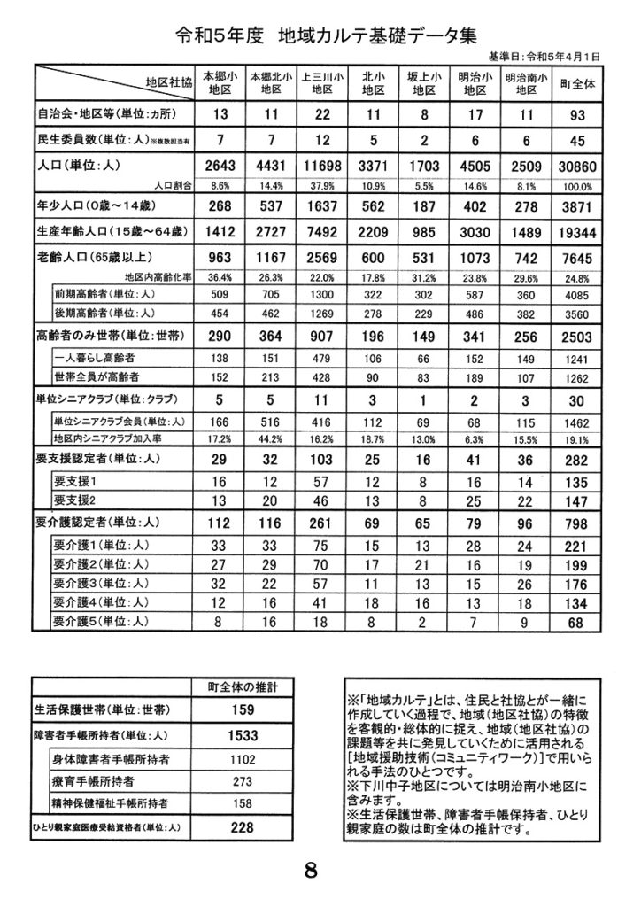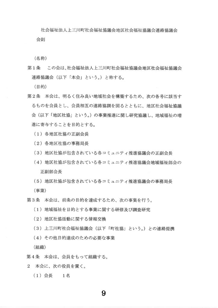 上三川町の地区社協は、「本郷小学校地区」「本郷北小学校地区」「上三川小学校地区」「坂上小学校地区」「北小学校地区」「明治小学校地区」「明治南小学校地区」の7地区があります。当連絡協議会は、会長1名。副会長2名を選出し、7地区相互の連携と情報交換、町事業への協力を図ることを目的とし、それぞれの地区には上三川町社会福祉協議会から担当者が就き活動を支援しています。
