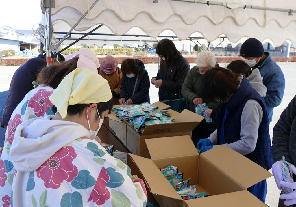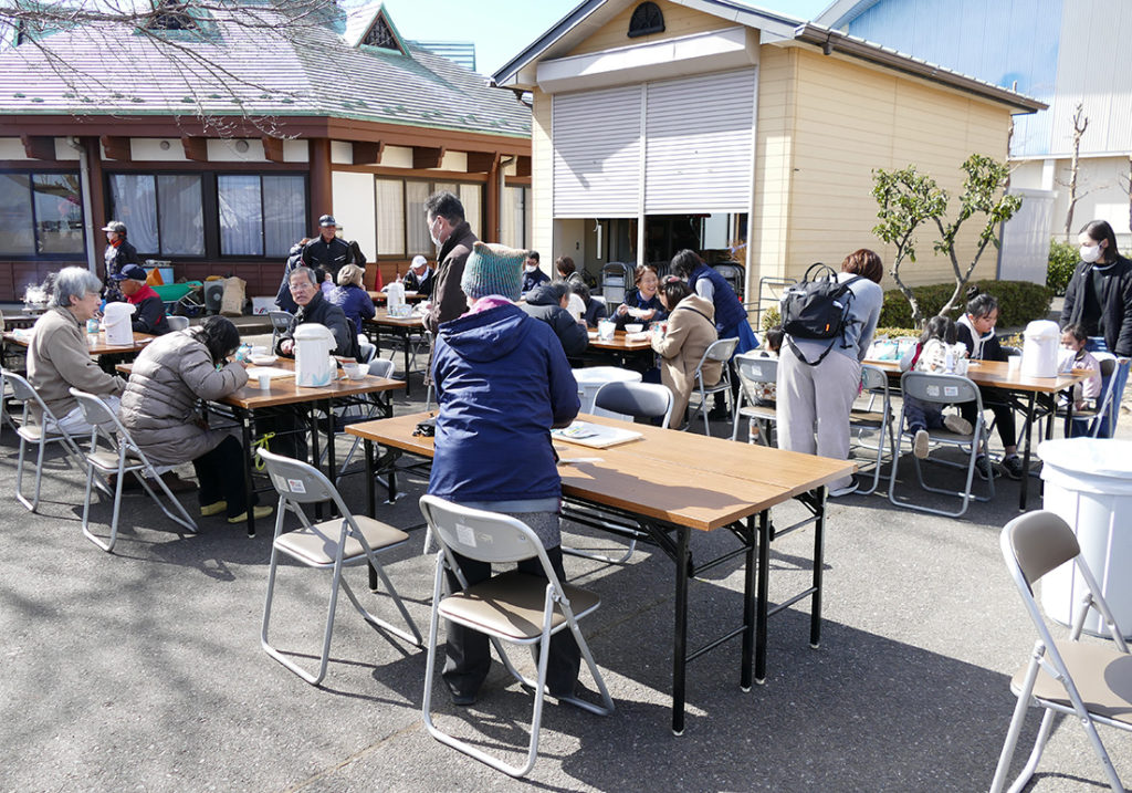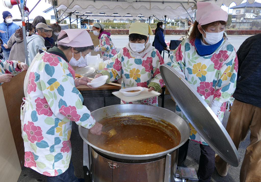 町社協の計らいで無償提供された「マジックライス」(お米の保存食)の準備が整い、カレーも出来上がり早速みんなで試食会を行いました。