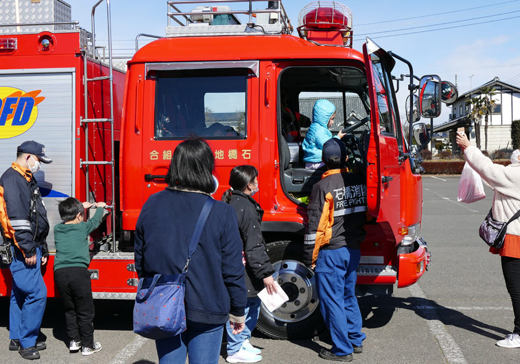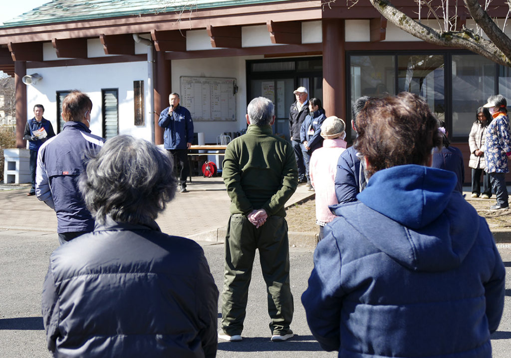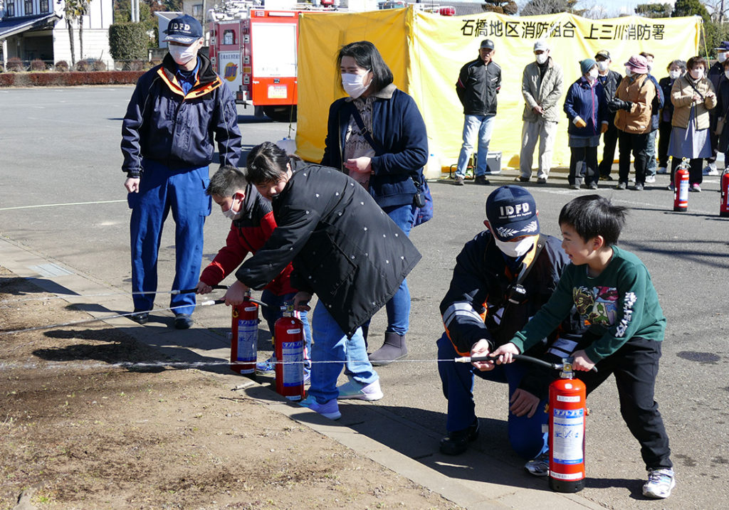 10時には訓練開始の朝礼を行い、町社会福祉協議会の飯田常務より挨拶をいただきました。その後、石橋地区消防組合の消防隊員の指導のもと消火器による消火体験や、火事では一番危険な煙に巻き込まれる状況を再現する「煙道体験」を行いました。