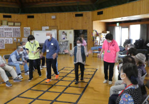 今回は、理学療法士の布川才浩氏と地域連携課の薄根裕佳氏を中心に、総勢11名もの職員スタッフが指導に来ていただき、美里地区の参加者も28名と多くの参加者が集まり、広間いっぱいの大盛況でした。