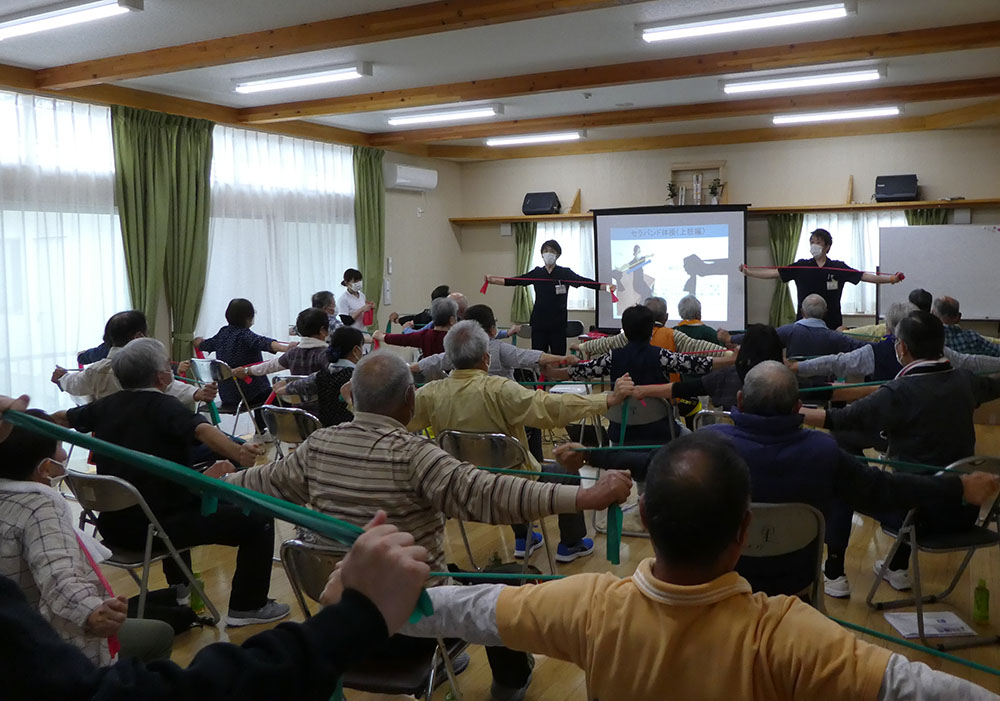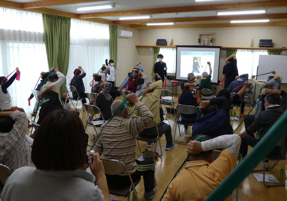実施されたのは、フレイル予防のため、THERABAND(セラバンド)と呼ばれるゴムバンドを使った軽い運動です。椅子に座った状態からでもゴムバンドの軽い負荷を受けながら様々なポージングで効率的に楽しみながらできるストレッチ運動です。