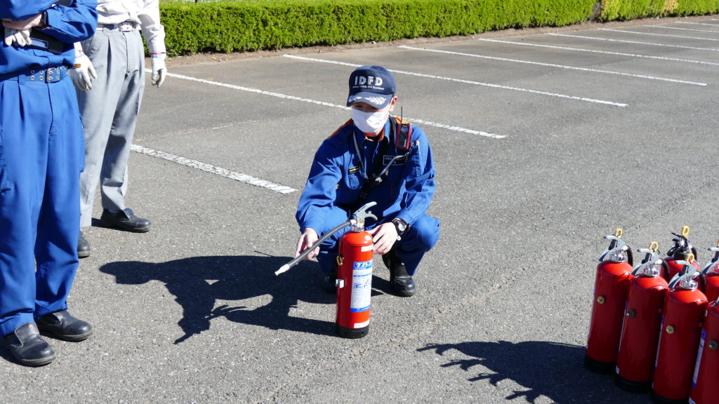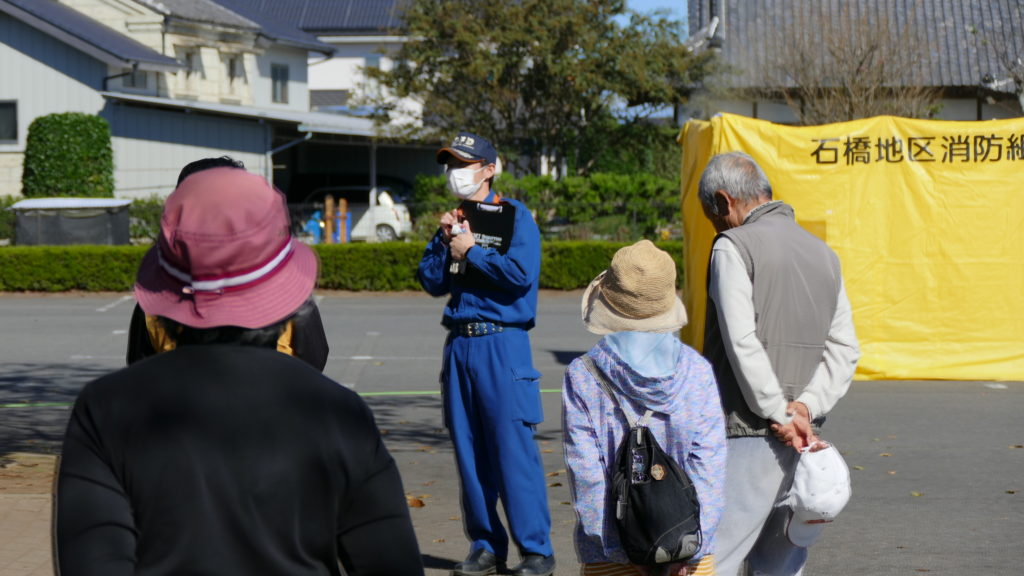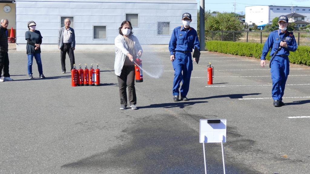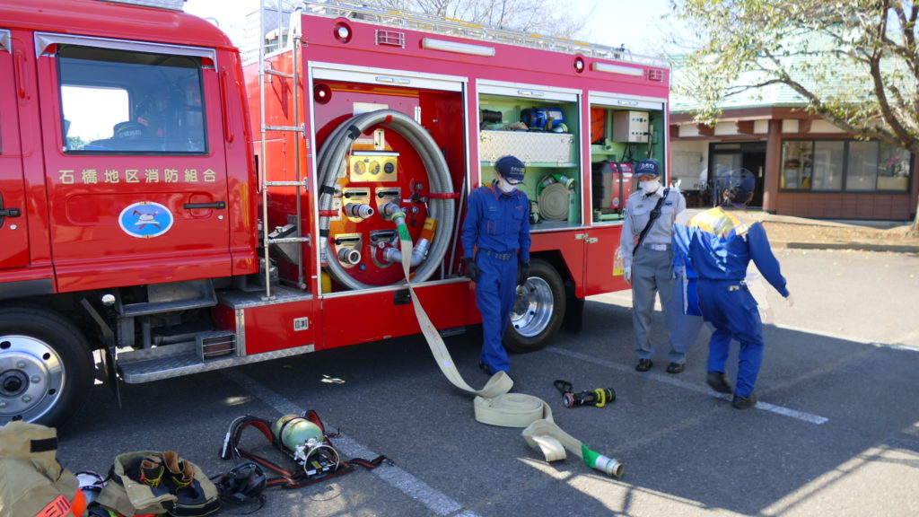 10月22日の午前中、石橋消防署隊員皆様のご協力により、消火器による消火訓練をはじめ、日頃目にすることがない救急車の内部や、消防車の設備など説明を受けました。